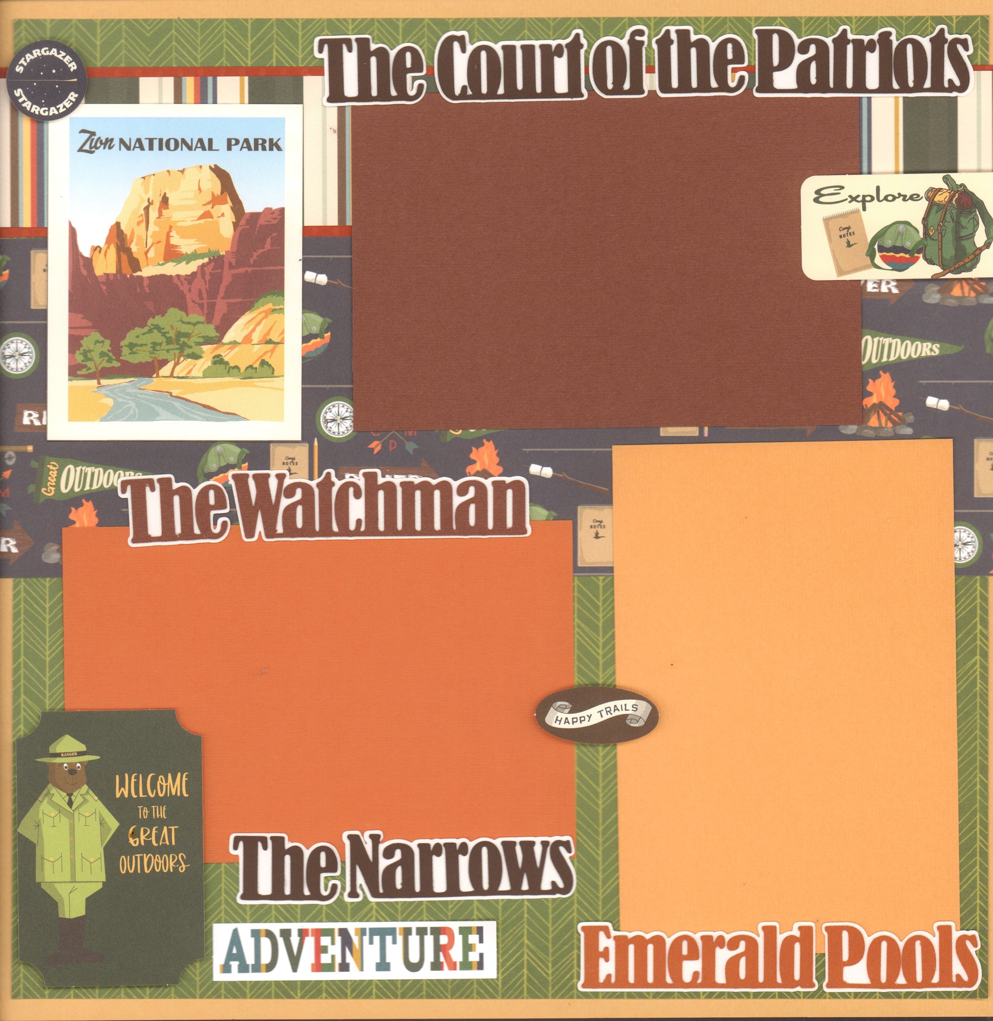 This is a 2 page 12 x 12 inch layout kit that is pre cut and you can place all your memories from Zion here. Includes 6 mini titles and a package ephemera.